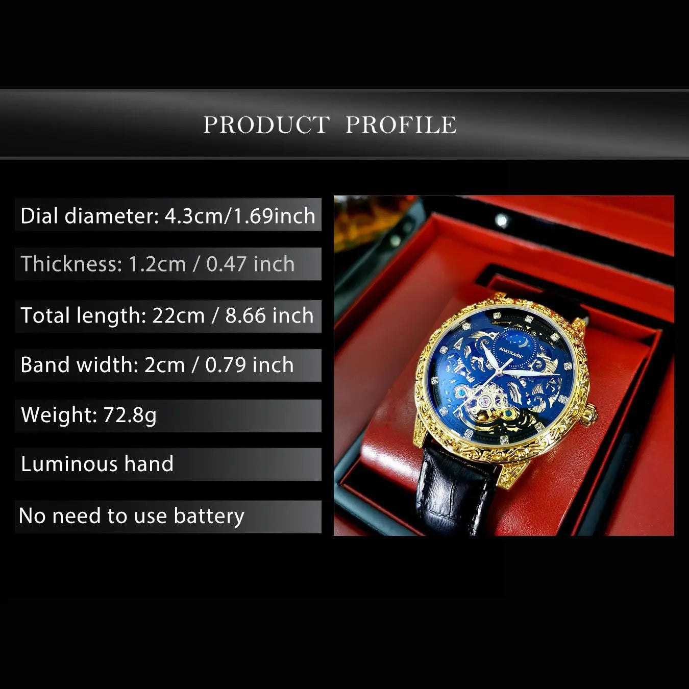 Automatic Mechanical Movement: Powered by wrist motion, eliminating the need for batteries while delivering precise timekeeping.