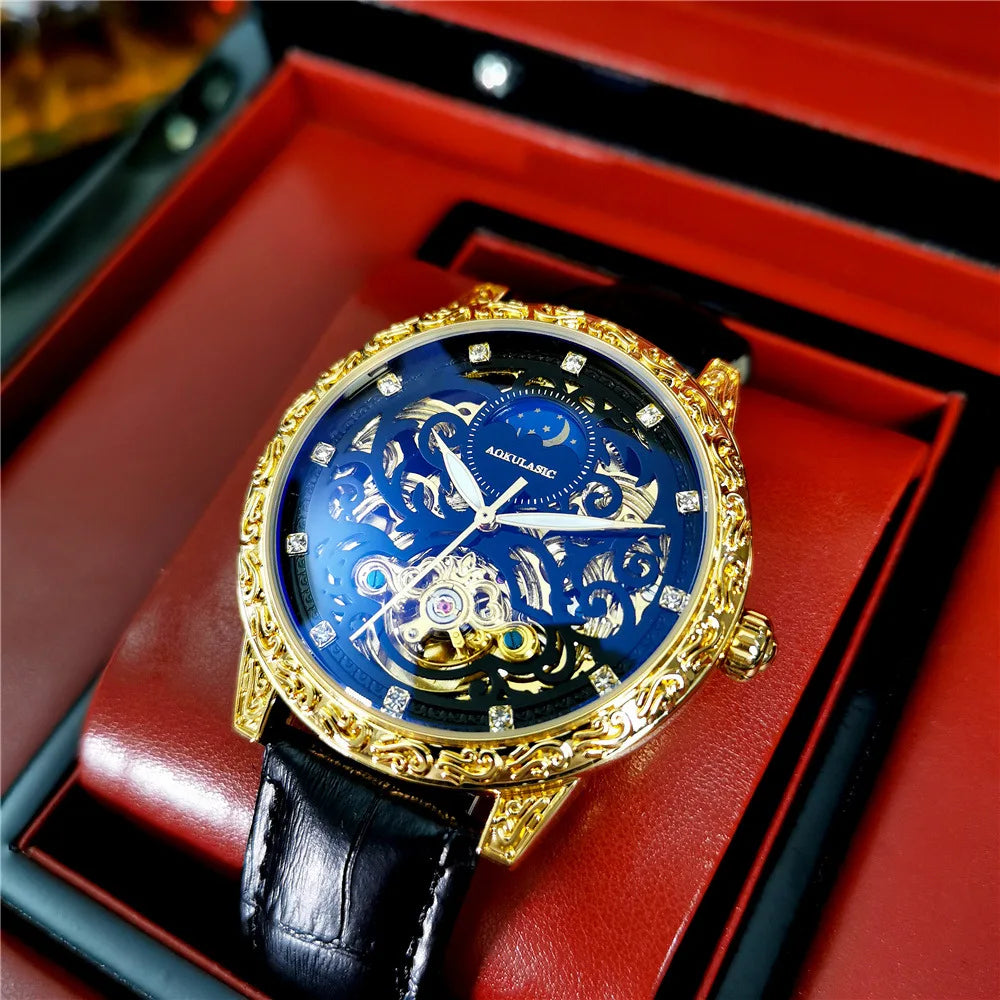 Tourbillon Skeleton Design: Showcases the complex automatic movement with a transparent dial for a captivating look.