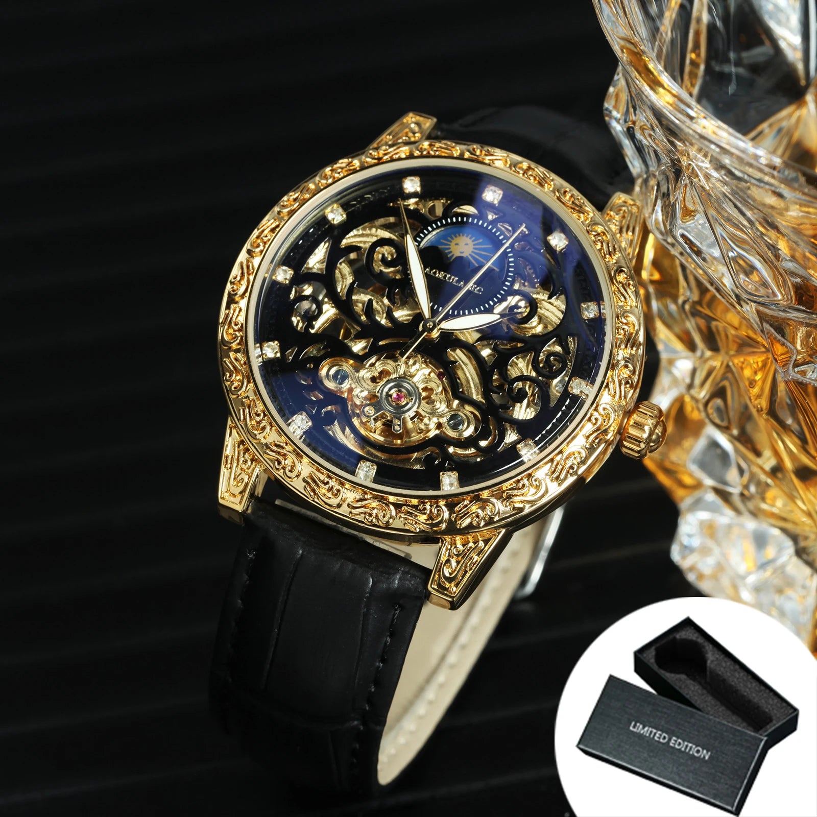 Luminous Hands: Ensures easy readability in low-light conditions, blending functionality with style.